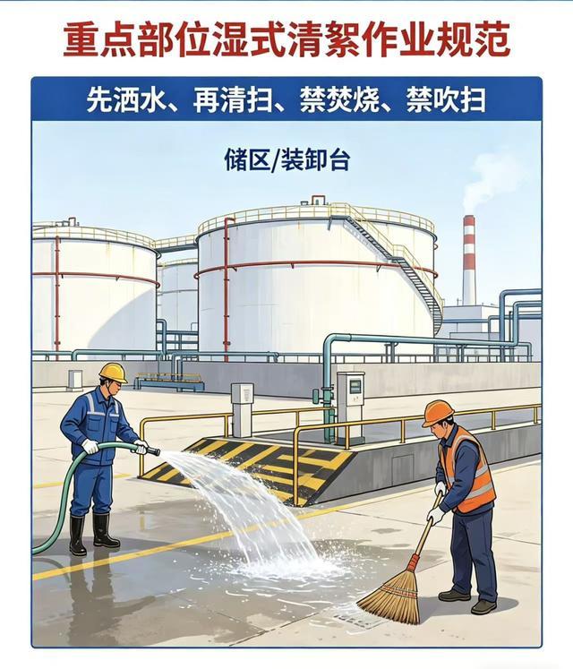 1. 全面清絮,杜绝可燃物堆积。要执行湿式清理,先洒水降絮,再清扫收集,严禁焚烧、吹扫飞絮。对储罐区、装卸台、加油岛、配电室、泵房、管沟、围墙边角、绿化带等重点部位每日巡查清理,及时清运絮状物,密闭存放,远离热源与危化品。